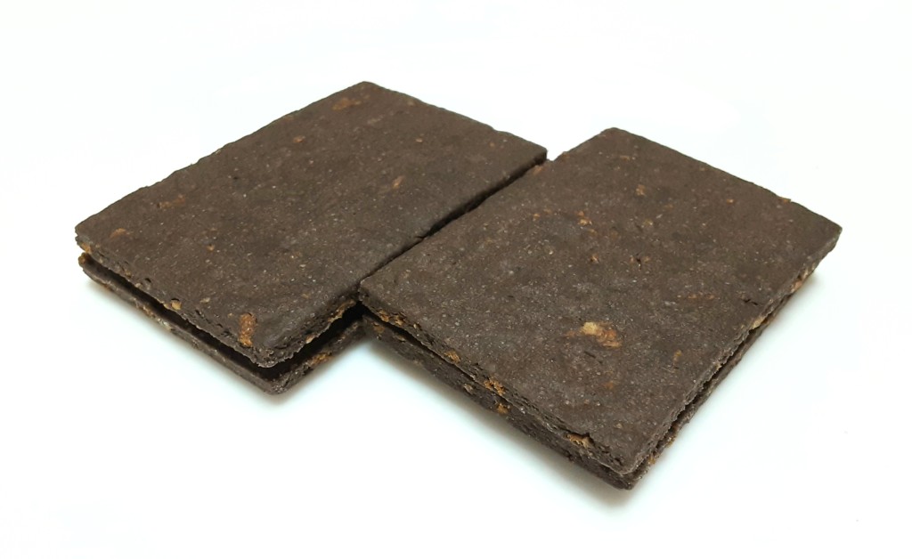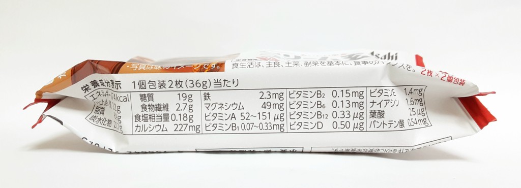 2枚×2袋入りで1個包装(2枚)当たり174カロリー。ココアパウダーが練り込まれた真っ黒な玄米ブランにの間にはさらに黒いチョコレートクリームが挟まれています。