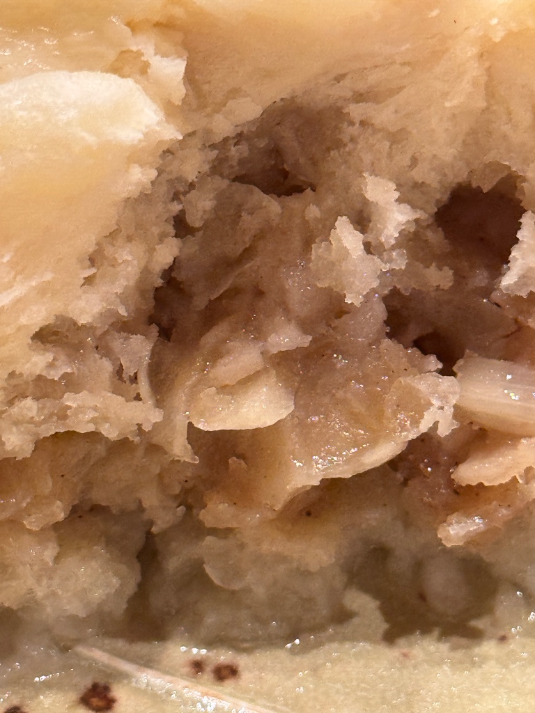中の具材は、粗めに刻まれた豚肉と玉ねぎがぎっしり詰まっており、ジューシーでしっかりとした味付け。豚肉の旨味と玉ねぎの甘みが口の中に広がり、食べ応えがあります。