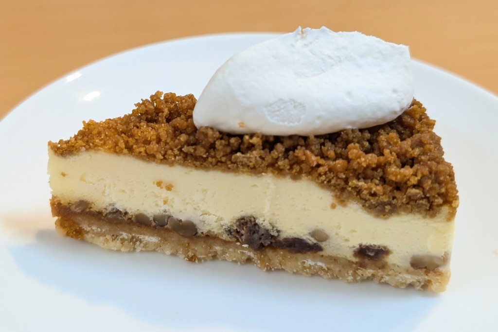 ザクザク食感のクランブルを敷き詰め、キャラメルフィリング、香ばしいナッツ、レーズン、なめらかで軽めなコクのチーズケーキ、さらに、ほのかにスパイスを効かせたクランブルをトッピングして焼き上げました。ホイップクリームをふんわりとのせて仕上げています。各層を一緒に食べることで、様々な食感と複雑に混ざり合う風味が口いっぱいに広がります。🧜♀️