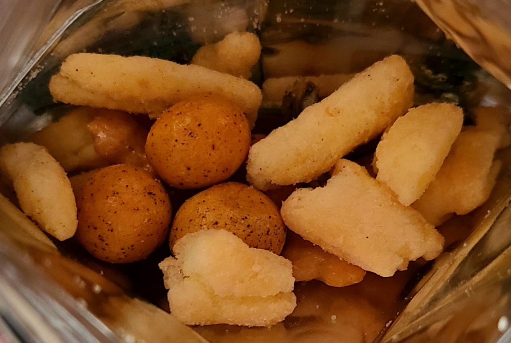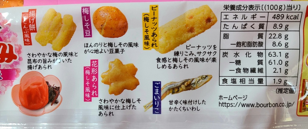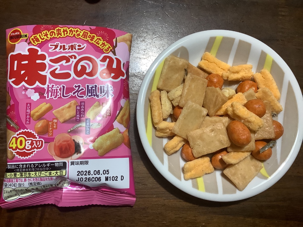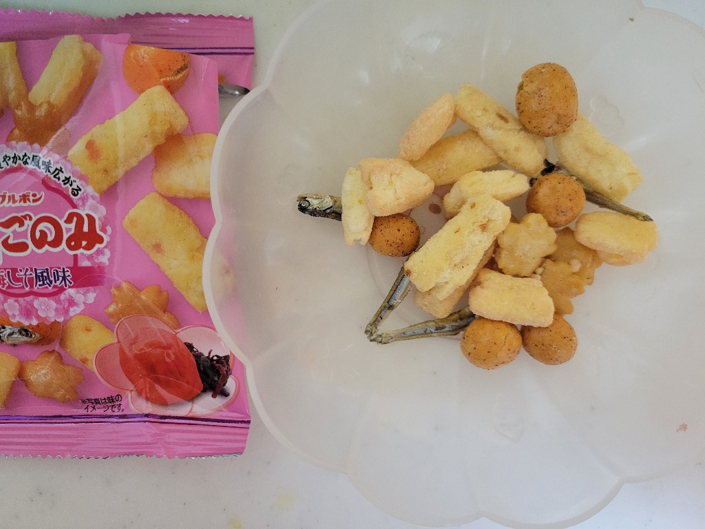梅味をまとったおかきや小魚、豆菓子の数種が一度に味わえます。