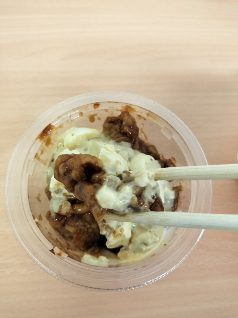鶏肉は、冷たいと固くなりがちですが、小さめに切ってあるのと、衣がちゃんとしていてタレがかかっているので、固さも気にならず美味しく食べれます!