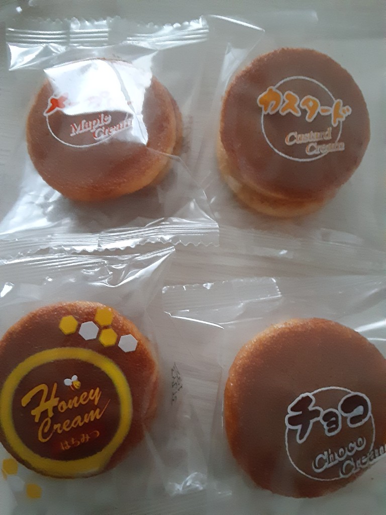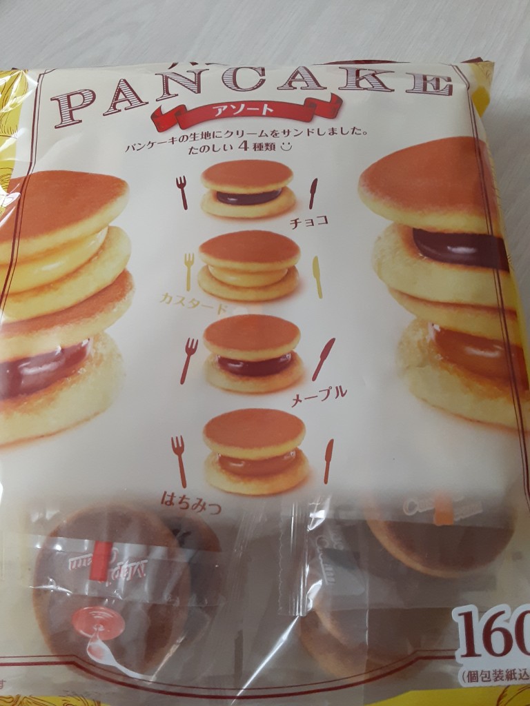 一口サイズのパンケーキで、チョコ・カスタード・メープル・はちみつの4種類が入っています。