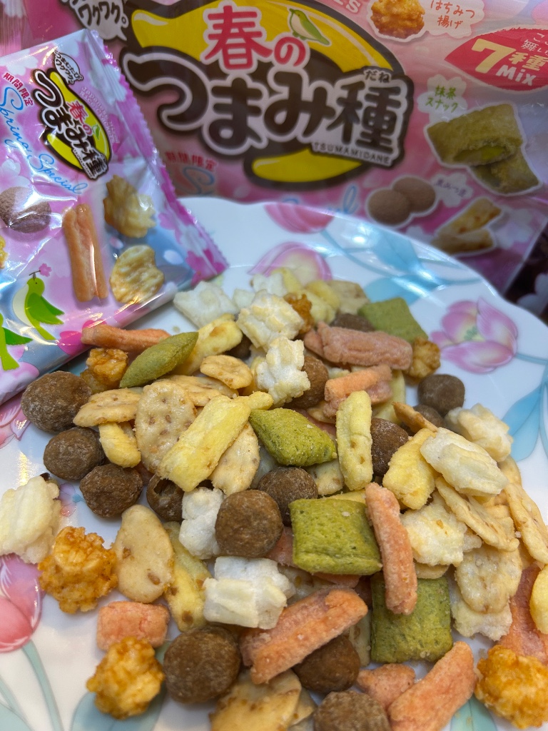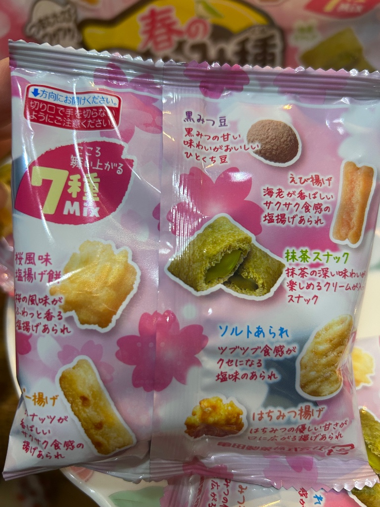 梅いか天、桜えび揚げ、桜風味塩揚げ餅、じゃこ山椒せん、ハーブソルト揚げ、黒みつ豆、ピー揚げの7種類入り‼️... 続きを読む
