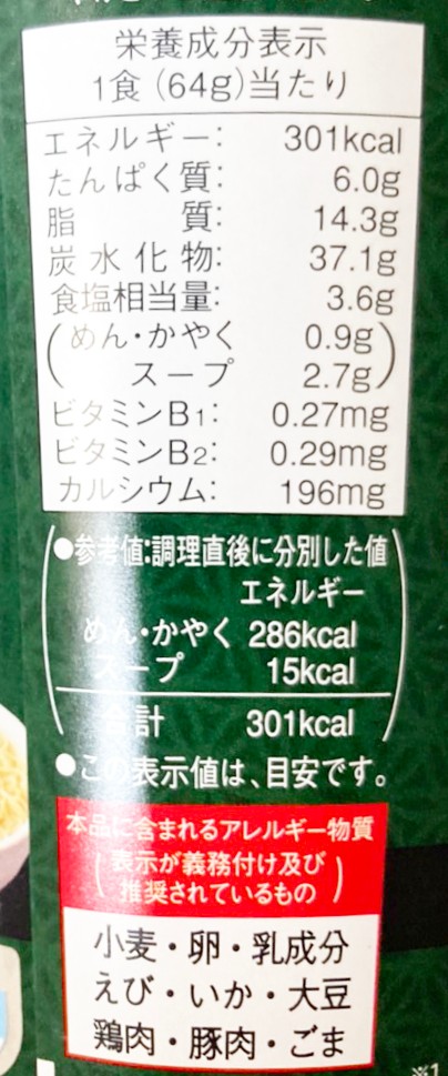 山わさび粉末入りのスープを楽しみたいのに湯量は控え目な280cc。麺は55g、かやくにキャベツたっぷりのカロリーは301kcalと低カロリー。エースコックの安心クオリティです。眠気覚ましの一杯にどうぞ。... 続きを読む
