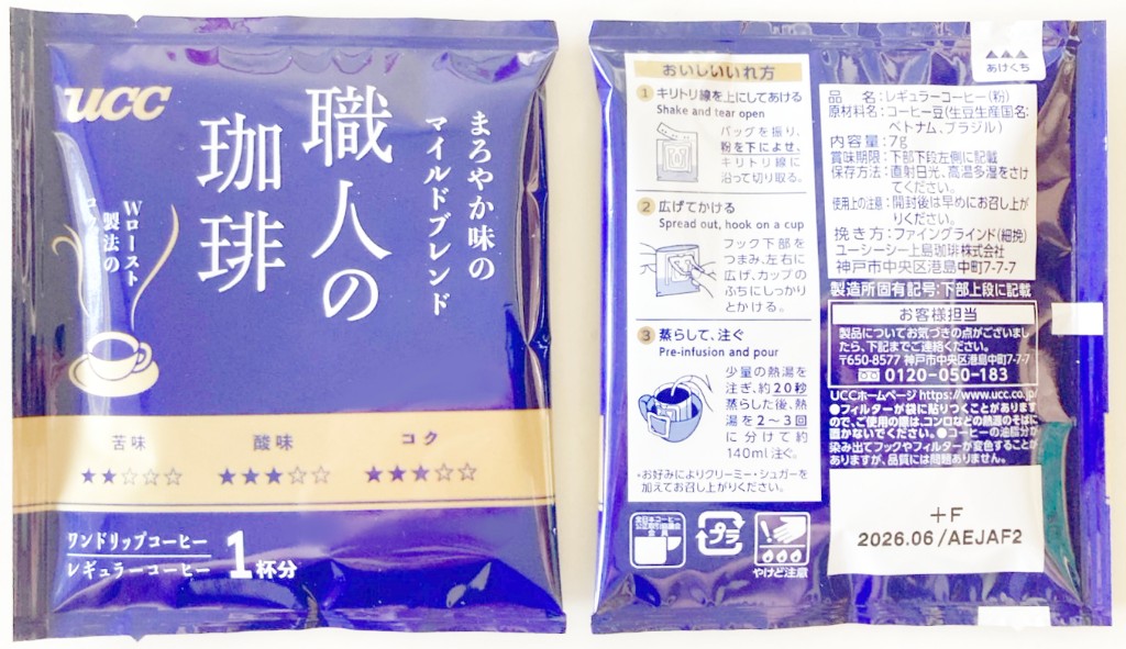 職人のコーヒー まろやか味のマイルドブレンド 青色のパッケージのドリップコーヒーです。