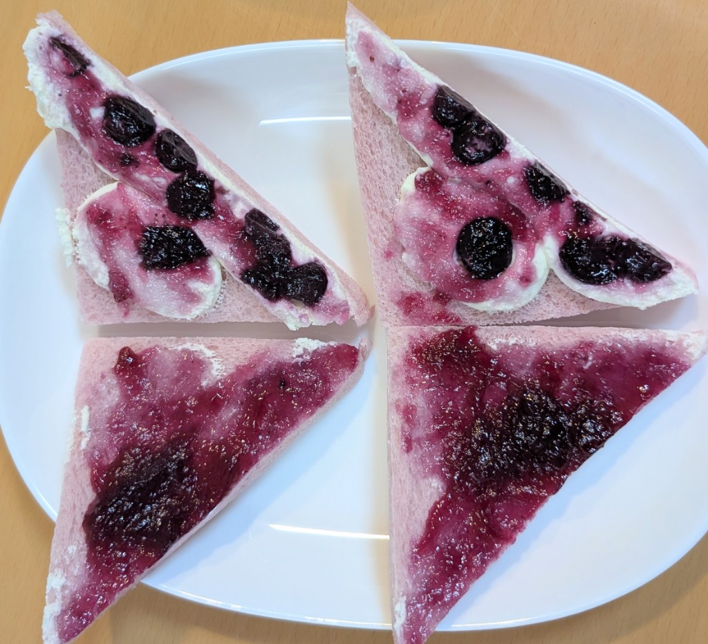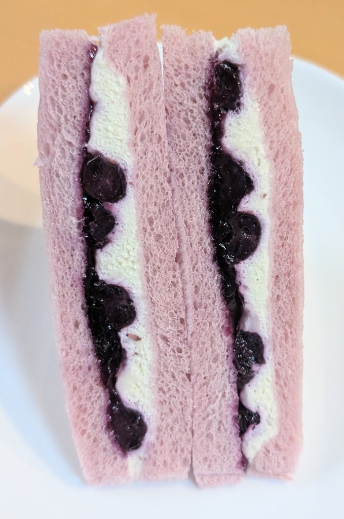 食べてみると、、クリームチーズ仕立てとあって重すぎずホイップ系の軽めなクリームにしっとりしたブルーベリーの甘酸っぱさとマッチしていて好みなフルーツサンドでした。