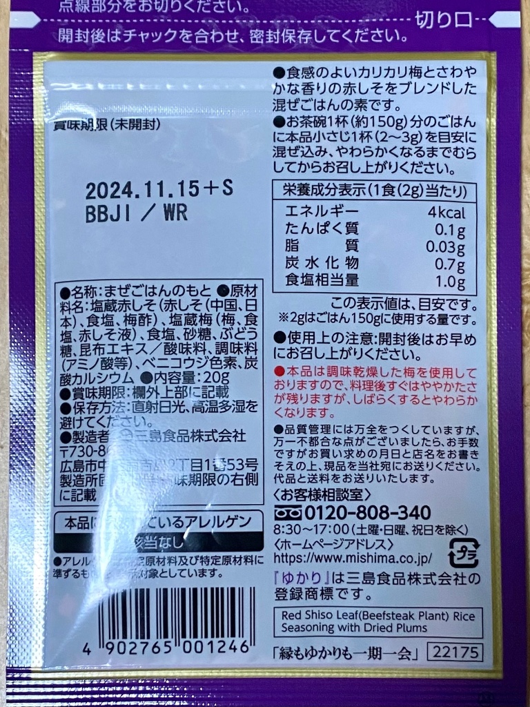 いつもは、梅入りじゃないソフトタイプのゆかりふりかけなのですが、梅入りしか置いてないお店だったのでこちらを買いました。