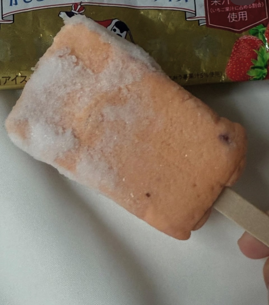 イチゴミルク色のアイスバー一口頂くとねっちりとした食感から甘いイチゴの味、そしてバターのような乳脂肪を感じます。かなり甘めでリッチなアイスバーで満足できます。