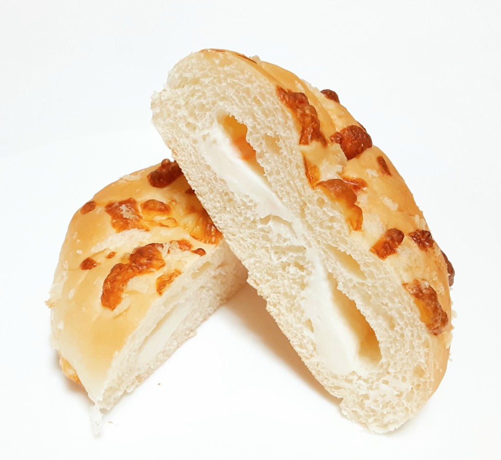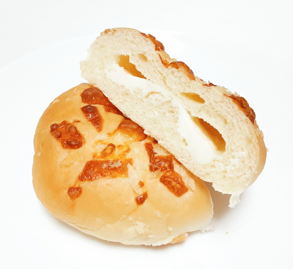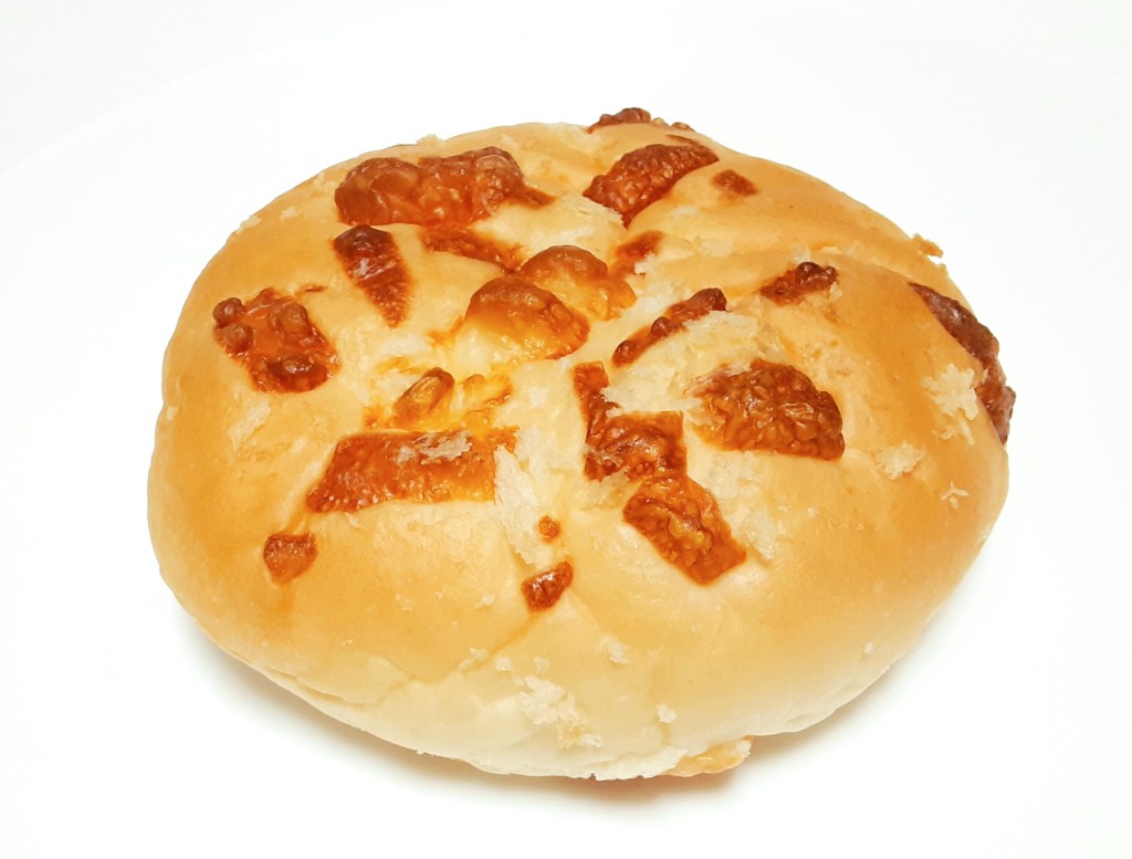 まだらに黄色と橙色、惣菜系のパンで使われているような、プロセスチーズ系の塩気のはっきりした中身で白いチーズクリーム要素は無し。生地はしっとり&ぺったり&のっぺりで網目の無いメロンパンそのもの(皮が普通に甘い)。