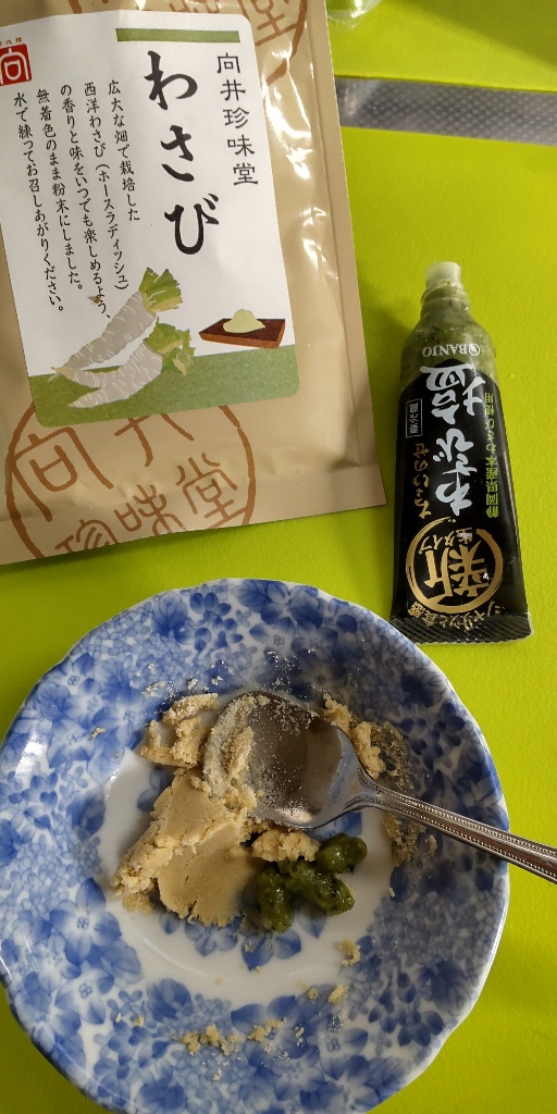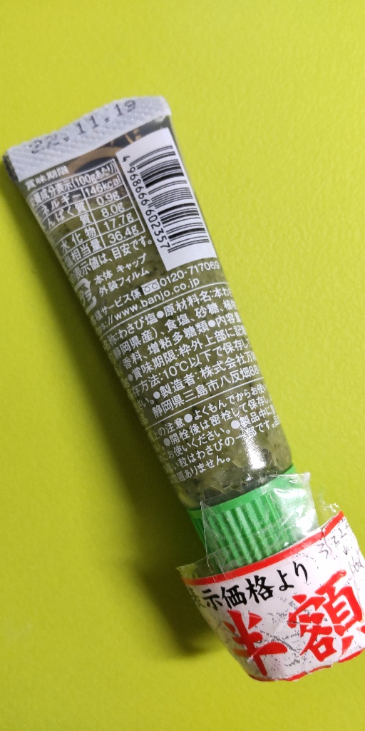悪くないけどしょっぱい🌿粗塩のジャリ感 静岡県産の本わさびの爽やかな香りと辛味に、まろやかな塩味とシャリッとした食感を両立させ、これまでにないわさびの新しい味わいを提供します。粗目の塩でわさびと塩味のマッチをより感じられ、使い勝手の良いチューブタイプで食材にのせることができる🌿 塩わさび、初めて😘💚 刺身売り場で、たまたま半額だったから買ってみた🌟 少ないのに322円高い😱... 続きを読む