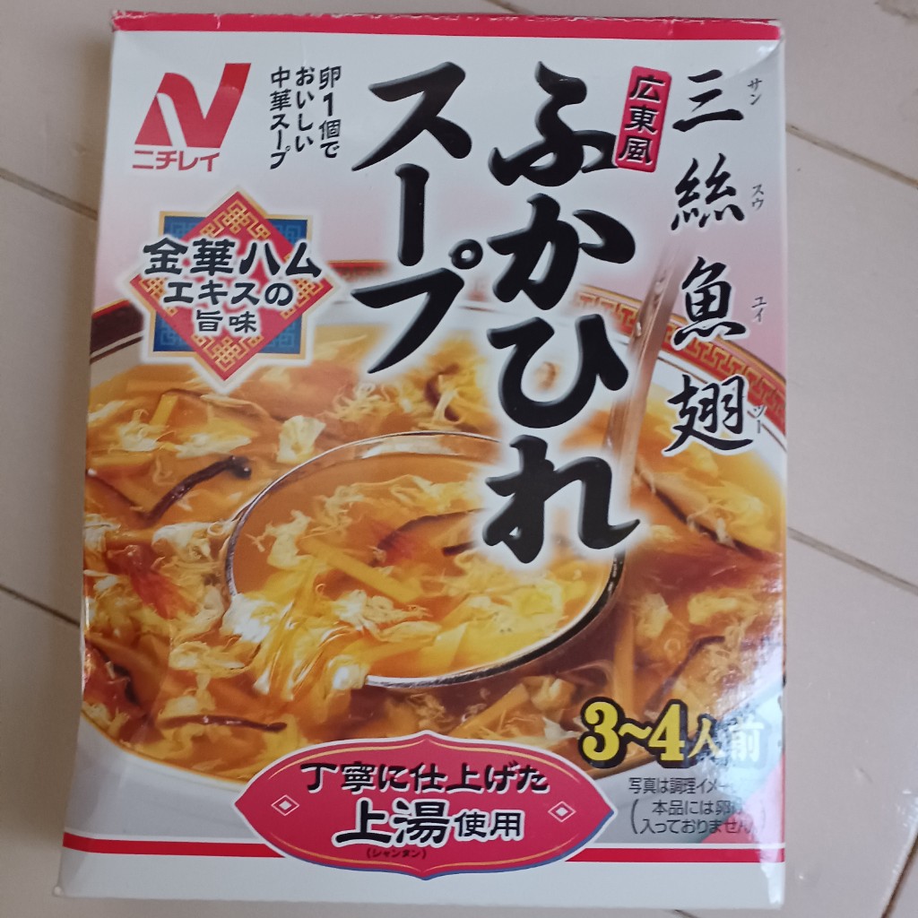 本物のフカヒレ、 椎茸、 たけのこ、きくらげが入っています。 卵1個、 といて 入れるだけで、 フカヒレスープが、できます! 鶏ガラスープと、 色々な、エキスいりで お店の味という位、本物に近いです‼︎ とろみがきいて、 味がしっかりしたスープです。 ずいぶん前からありますが 、ニチレイはすごい❗️ 初めて 食べた時は、 驚きました! スープだけでなく、 今は、ごはんをいれて 雑炊風にしたり、豚肉、白菜を薄く切って、 あんかけ麺にかけたりします。 家にあれば、サッとできるので、 お助けの一品❗️ おいしいとしか 感想がありません😄。 一度買うと、また買いたくなるスープの素。 この味は、なかなかないと思います。 量の少ないのもあるので、男性の方でも 卵1個で 簡単にできますよ! 食べてもらいたいっ(^.^)‼️... 続きを読む