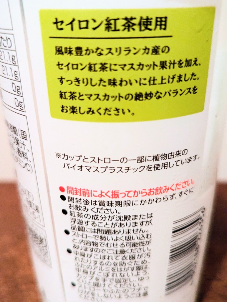 茶葉にはセイロン紅茶を使っており、紅茶の渋みのほうがマスカットの味に勝っており、けっこう渋めの味がする。