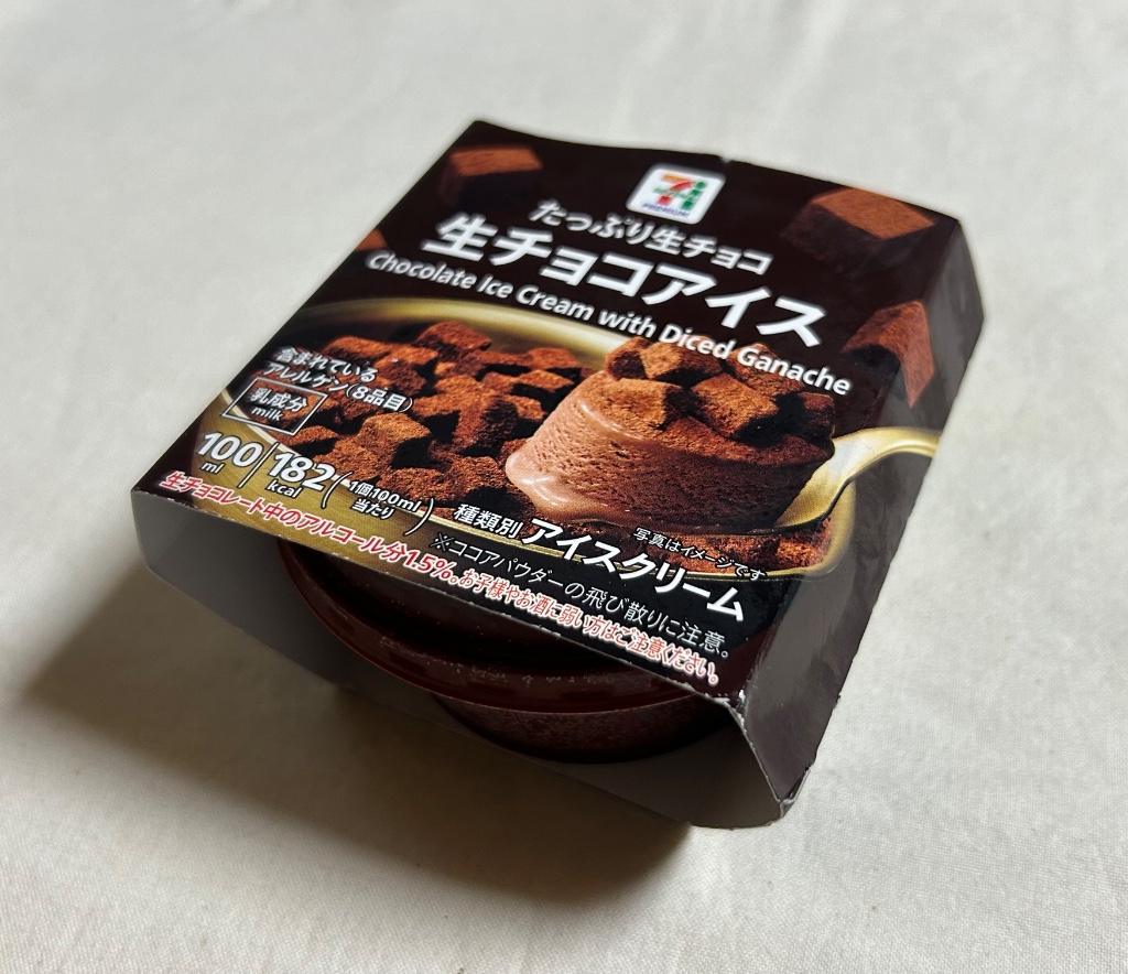アイスクリーム規格のチョコアイスに、角切り生チョコとココアパウダーが載っています。ロングセラーなだけの事はあるかなと感じる品です。一緒に並んでいたら、新商品冒険するよりこの安定感に惹かれて選択するかな~という感じ。