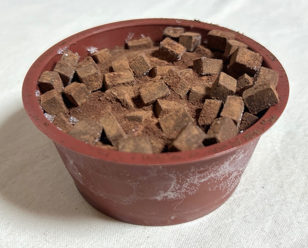 蓋を空けると、ダイスカットされた生チョコがゴロゴロ。ココアパウダーが全体的にかかっており、まるで生チョコの採石場のよう(褒めてます)。