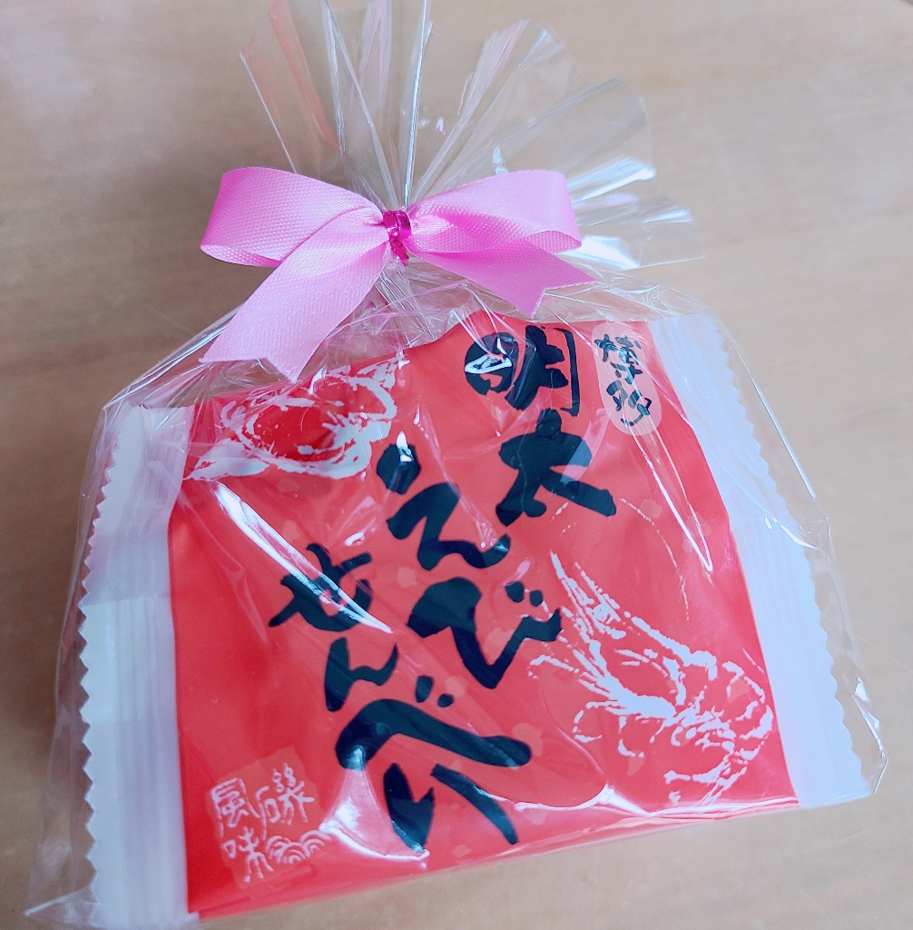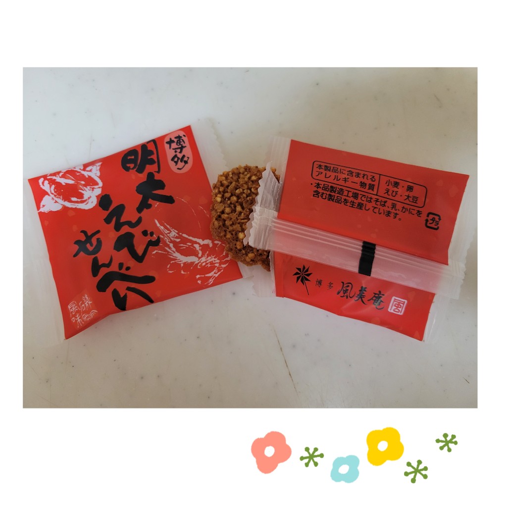 えびの風味がガツンってやってきて、本当にほのかに明太子のピリって感じもあるけど、甘さが強いおせんべいです。