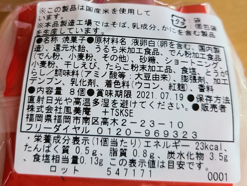 味は、えび、明太子の味で、結構濃い目の甘辛味で止まらない味わいです。