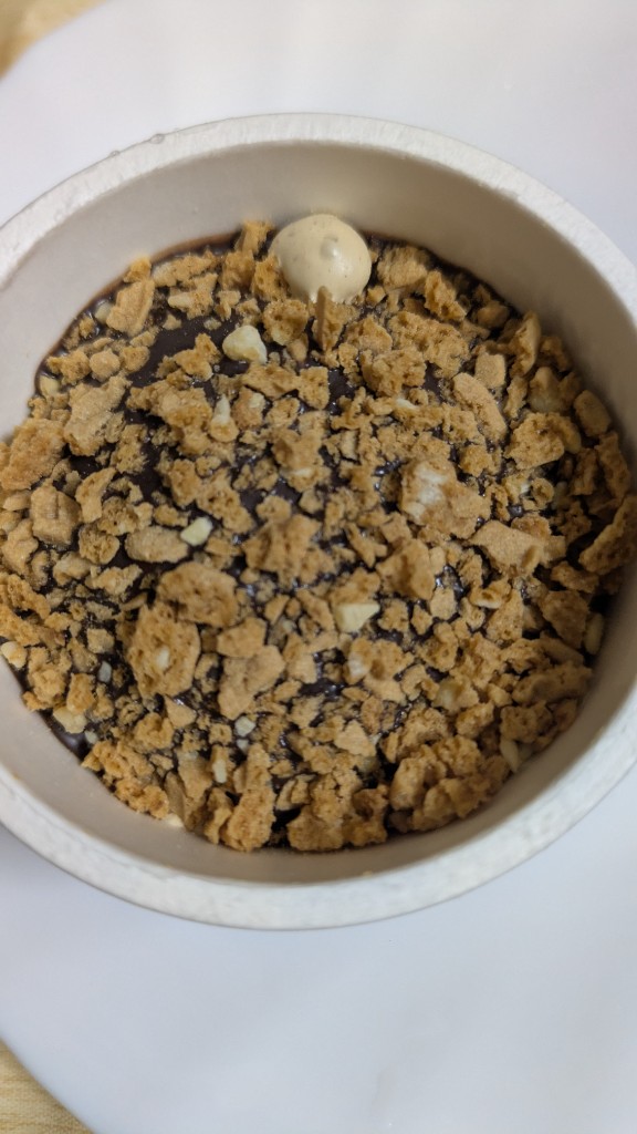 上にチョコとナッツとクランブルがたっぷり乗ってて硬かった。ちょっと待ったほうが柔らかくなって食べやすいと思います。