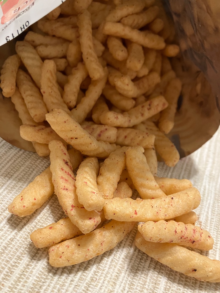 えびせんの横模様に赤い梅パウダーがガッツリついているとのを見かけると、ニンマリ嬉しくなってしまう。味は、エビのあじをしっかり感じられてるのに梅の風味もわかる。どっちかに偏ってしまうだろうに。完熟梅ってどんな味?梅干し?塩分何パーの?はちみつとかの甘いやつ?って疑問に思ってしまう。やさしい梅風味だな。個人の好みとしては、もう少しパウダーほしい!