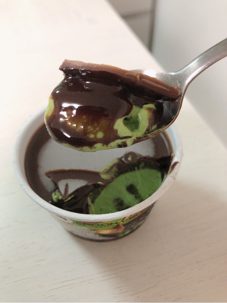 パリっとしたチョコレートを砕くのが楽しいです。チョコレートソースがとろり、抹茶アイスとよく合います。抹茶アイスの中のクッキーのおかげで食感が加わり、食べていて飽きないです。抹茶味のアイスは、抹茶味のみなことが多いですが、この商品はチョコと抹茶の組み合わせで1つ上のスイーツになっている!と思いました。
