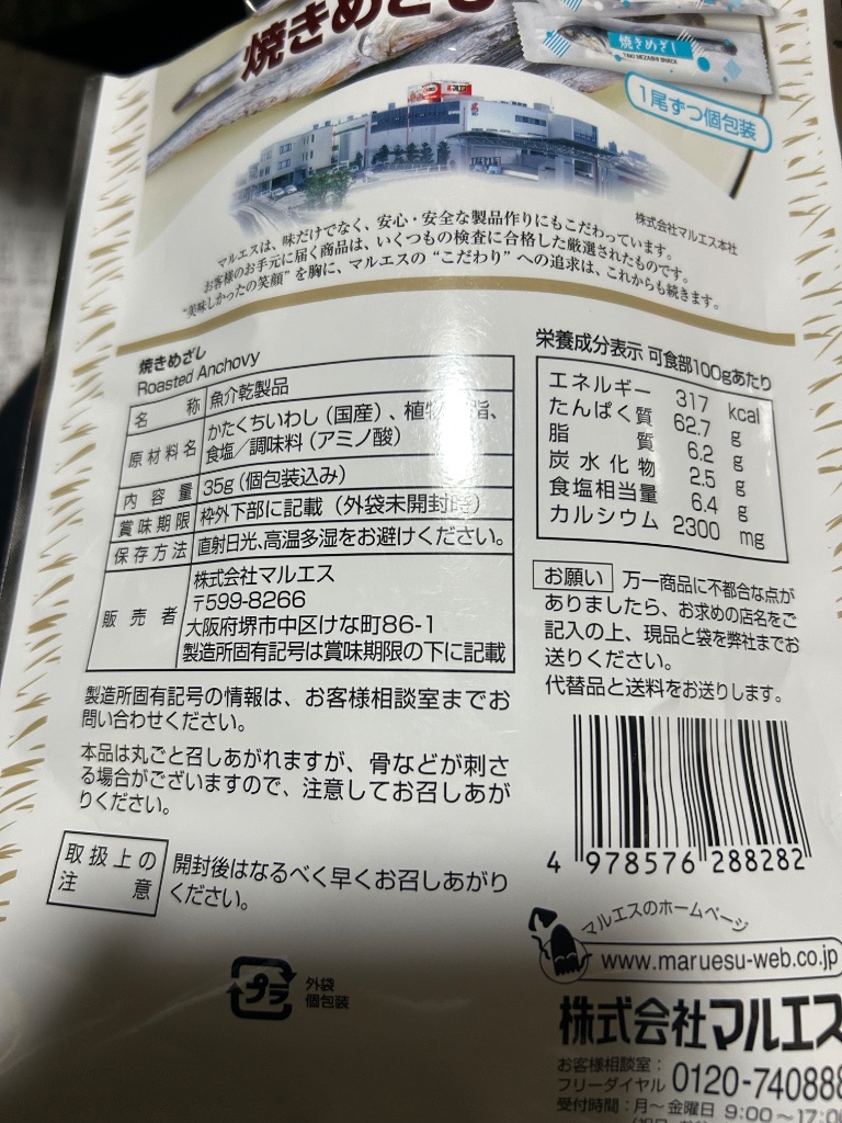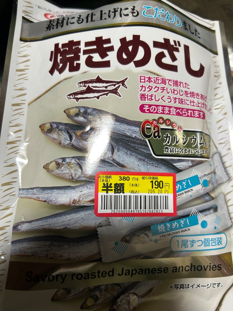 出かけた帰りに立ち寄りレジ付近の値下げコーナーに置いてありました 商品名 焼きめざし 日本近海で採れたカタクチいわしを焼き上げ薄味に仕上げたもの そのまま食べられる カルシウムたっぷり 一本ずつ個包装されている 大きさはバラバラで8〜10cm程度 美味しくいただきました #食欲の秋 可食部100gあたり エネルギー 317kcal たんぱく質 62.7g 脂質 6.2g 炭水化物 2.5g 食塩相当量 6.4g カルシウム 2300m…続きを読む