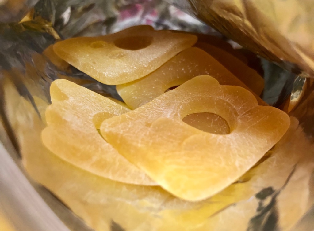 ちょっと香料感強めのゴールドパイン味ですが噛むたびにフレッシュでジューシーさがあってうすい形でかたい食感がクセになる美味しさ♡