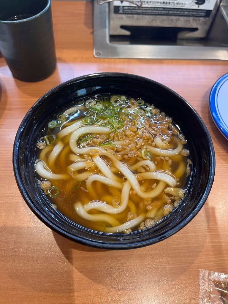 麺は程よくコシがあり、香りの良い優しいお出汁の味にネギと天かすがトッピングされています✨