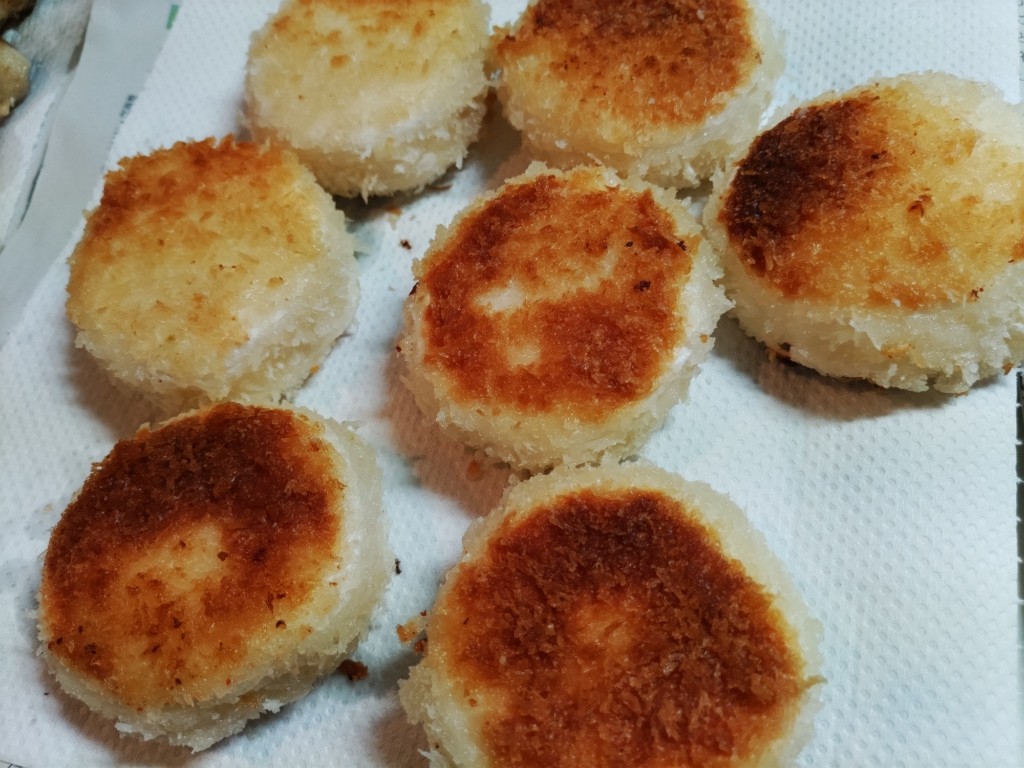 1口サイズの丸いはんぺんの中にチーズが入っている。