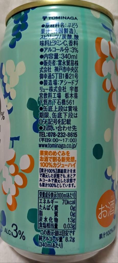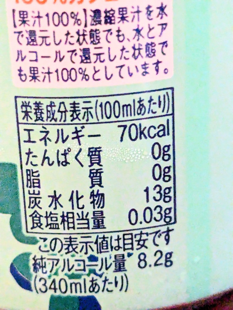 アルコール分3%、果汁100%(濃縮還元)、カロリー70kcalになります。