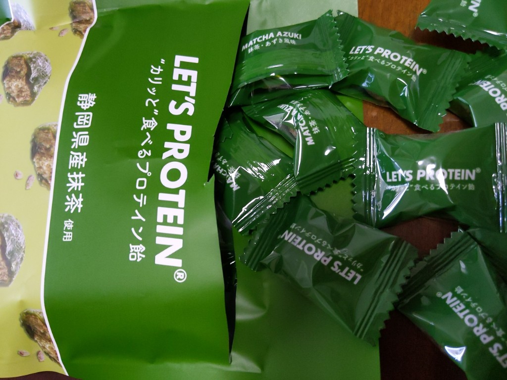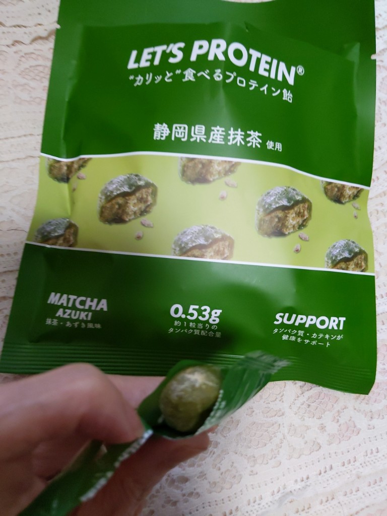 静岡茶のお菓子は京都や西尾抹茶味より何となく粗い緑茶のイメージがあるけどこれも苦みがあって甘²🍬ではなく中の豆のクランチ(🍓みるくの中身似)が美味しい😋17個入✕0.53gプロテイン一袋食べて9gは多く無いけど🍬として食べて👏良い🍬にしては美味しい