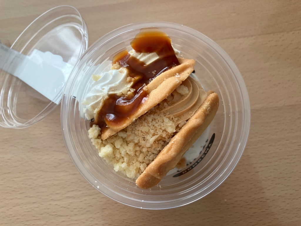キャラメルホイップは、淡いベージュのキャラメル色。どこか懐かしいキャラメル味ですが、ここはそんなに甘くない。キャラメルソースはけっこう甘いけど、量は少しだし、クッキーやクルトンはふんわりやわらかな甘さだから、合わせればちょうどよい。味に飽きません。