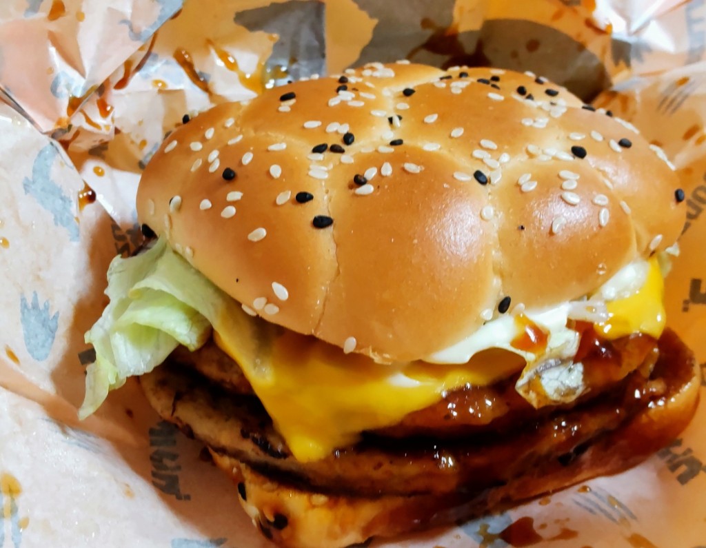 2枚のポークパティをてりやき風味のソースと絡め、コクのあるチーズとともに