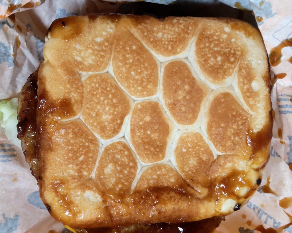 ゴジラをイメージしたゴツゴツのオリジナルバンズでサンドしました。