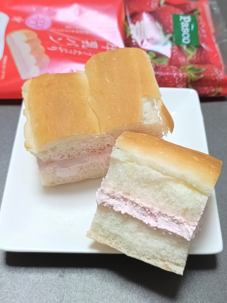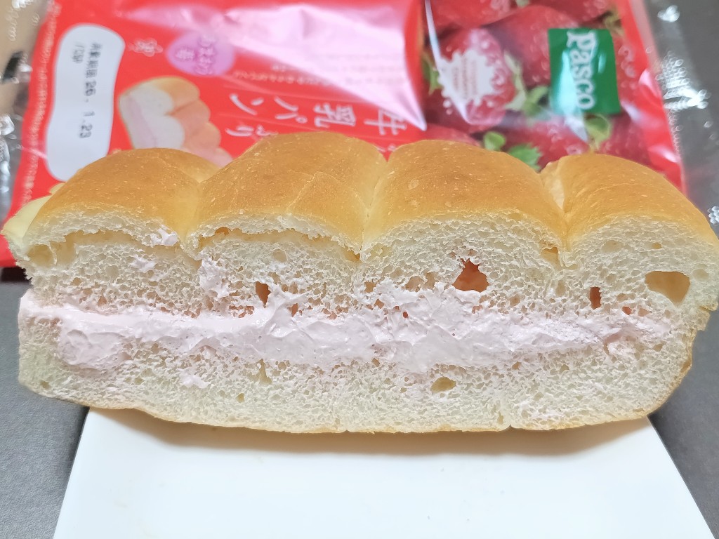 見た目はややほっそりした牛乳パンで、山形バンズに薄ピンク色のクリームがサンドされている。