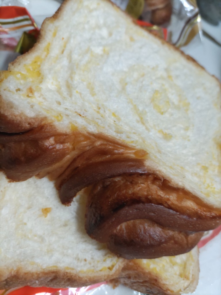 デニッシュみたいな生地の食パン(だから日にちが経って縮んだんだねー)。オレンジが縦に層になって入っています。4枚切り?5枚切り?その中間くらいの厚さです。