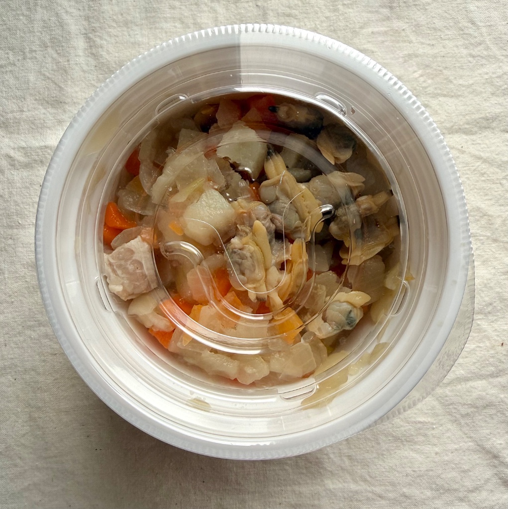 あさりとベーコン、玉ねぎ、人参、じゃがいもなどなど、具沢山なセブンのクラムチャウダー。
