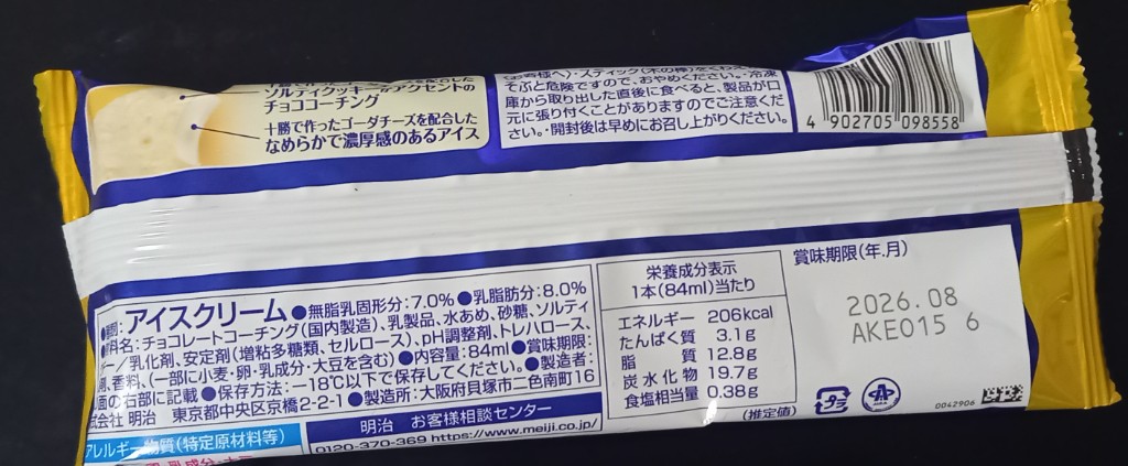 明治 十勝チーズアイス 濃厚チーズケーキ 袋84mlは、明治北海道十勝ゴーダチーズを使用したチーズパウダーを、アイスとチョココーティングの両方に使用することで、しっかりとしたチーズを楽しめる濃厚チーズケーキのようなアイスバーです。チーズ原料は北海道十勝ゴーダチーズのみを使用することで、チーズ本来の風味を感じられます。また、乳のコクをしっかり感じることができるアイスクリーム規格で仕上げることで、濃厚チーズケーキのようなデザートとしての本格感を表現しました。加えて、チーズ風味のホワイトチョコにはソルティクッキーを配合することで、食感と風味のアクセントをお楽しみいただけます。チーズケーキを食べているみたいです。チーズが濃厚でミルクのコクがあります。クッキーがサクサクです。... 続きを読む