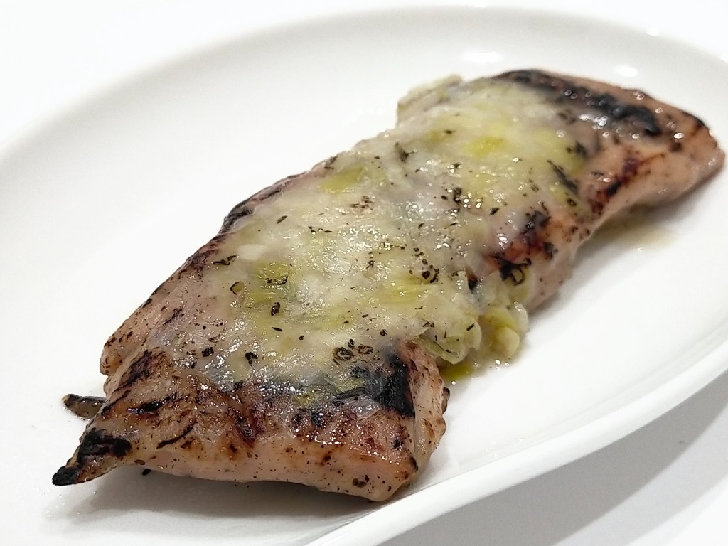 ねぎ塩だれがたくさんかかっていてにんにくとねぎの香りがします。チキンはやわらかで味が濃いです。ねぎとにんにくが好きな人は気にいると思いますが私はあんまり好きではないかな。