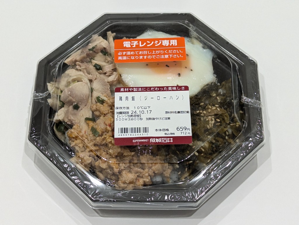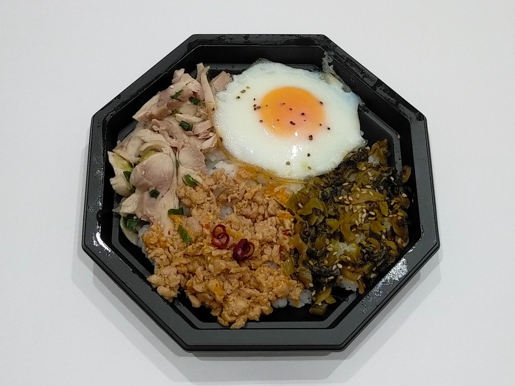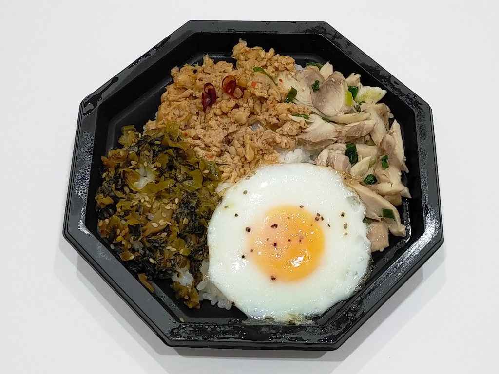 ◆2種の味つけ鶏肉と高菜、目玉焼きをトッピング