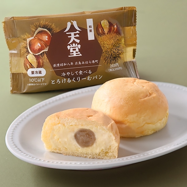八天堂の冷やして食べる、とろけるくりーむパンです。茨城県産の和栗を使用したペーストとマロン風味クリームを入れました。