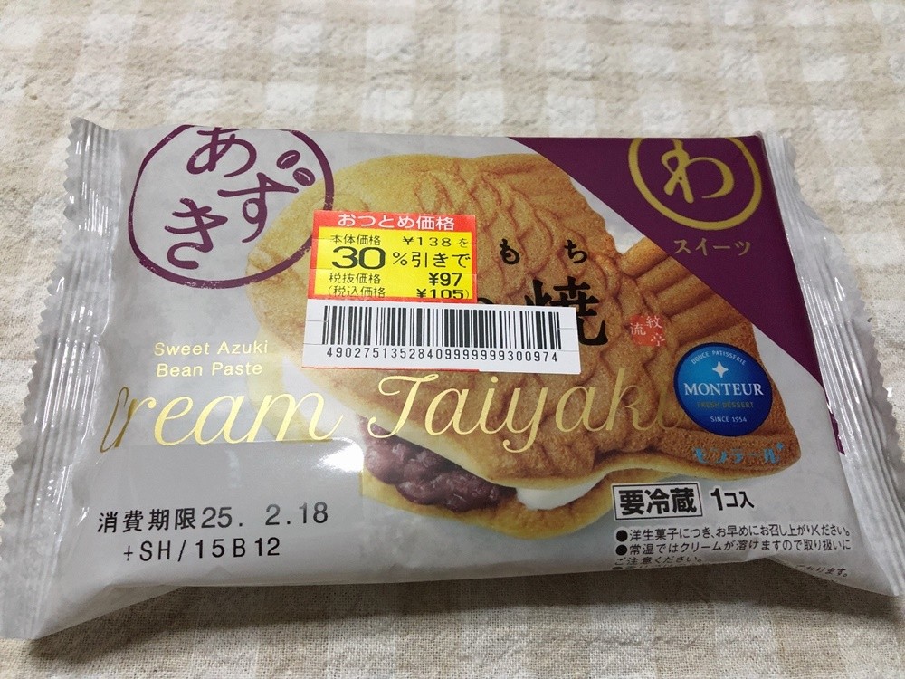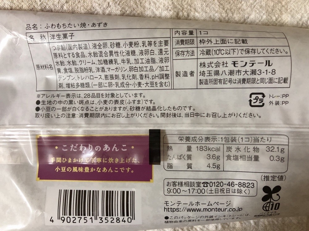 モンテール ふわもちたい焼・あずき 183Kcal 以前カスタードがおいしかったので買ってみました! つぶあんとホイップ入りのふわもちたい焼き♡... 続きを読む