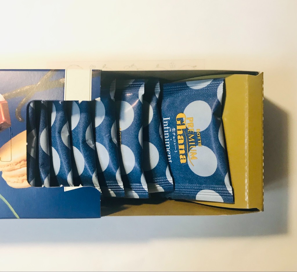 中身は個包装で12枚入り。通常のプレミアムガーナと異なり水玉模様がついていてちょっとおしゃれ。... 続きを読む
