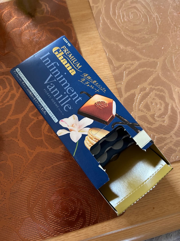 高いけどクーポンで少しだけ安く買いました。箱のビジュアルにまた惹かれてしまいました。ホワイトチョコじゃなくてバニラってどんなだろ?ずーっと気になってたので。常温がベストっぽいので、冷蔵庫には入れずそのままで。