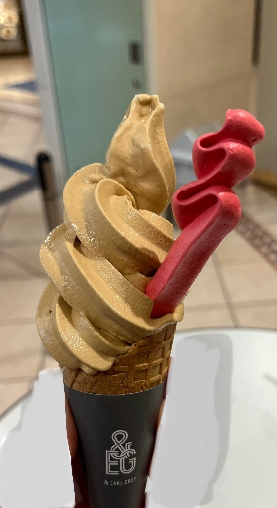 「天然ベルガモット香る&アールグレイのソフトクリーム じっくり煮出した自家製の紅茶を贅沢に合わせ、 最後に香りをトッピング。一口目にベルガモットが華やかに訪れ、 後から紅茶の風味が広がっていく。 濃厚なのにさっぱりとした味わいは、まさに“食べるミルクティー”です。」 百貨店のバレンタイン催事の実演販売で購入しました。 ソフトクリームはとてもあっさりしています。 微細氷の塊を舌で押し崩すような、少しコーンタイプのあいすくりんにミルク感を足したような口当たりです。... 続きを読む