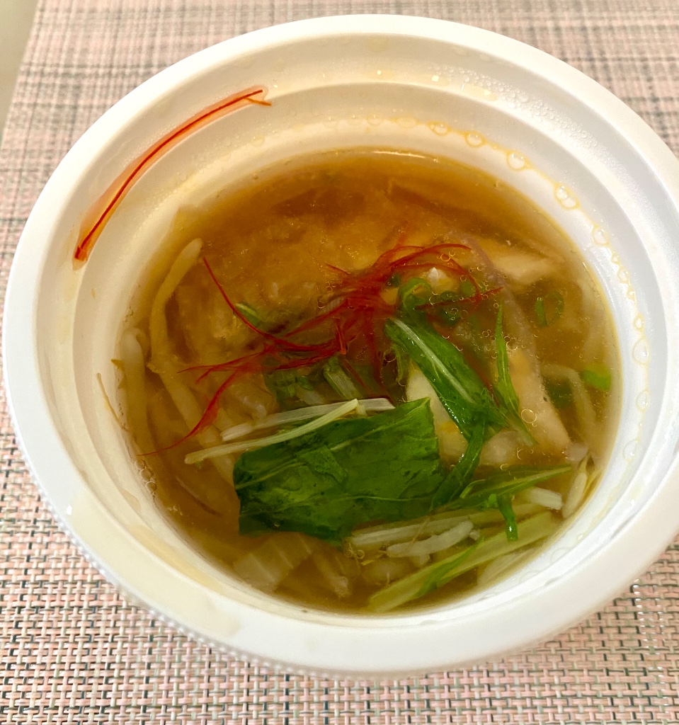 もやし、玉ねぎ、水菜の控えめながら食感が楽しい野菜となめらかな平はるさめ➕ピリッと辛い輪切り唐辛子、4切れも入った大きめ鶏肉(※後日いただいたものは少なかったのでランダムなようです💦)、、、極めつけは飲めば飲むほど鶏ィィィ‼️‼️‼️な極うまスープ😵💫💕