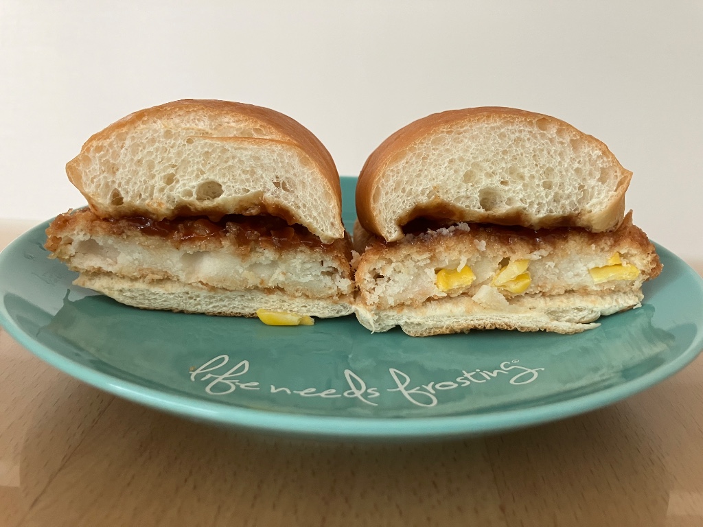 ふっくらしたパンにコーンコロッケと甘口ソースをサンドしました。