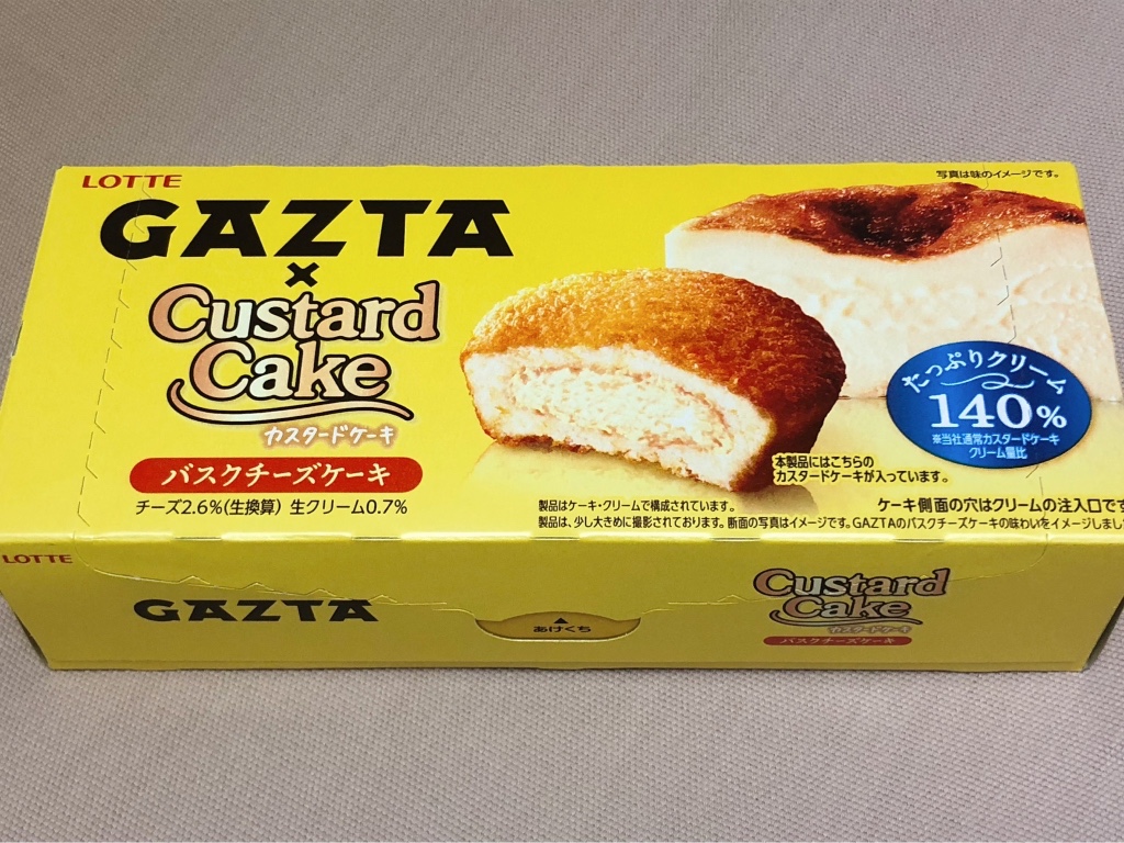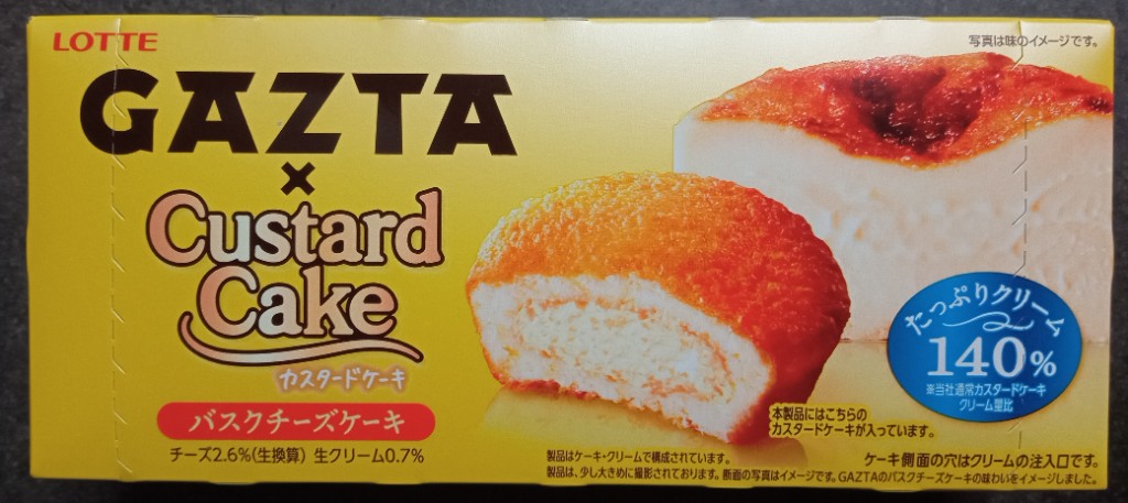 「GAZTAの看板商品であるバスクチーズケーキの味わいをカスタードケーキで表現。生クリーム入りふんわりカスタードケーキの中に、なめらかなクリームチーズカスタードクリームを閉じ込めており、クリーミーなチーズの味わいを堪能できるカスタードケーキ。」