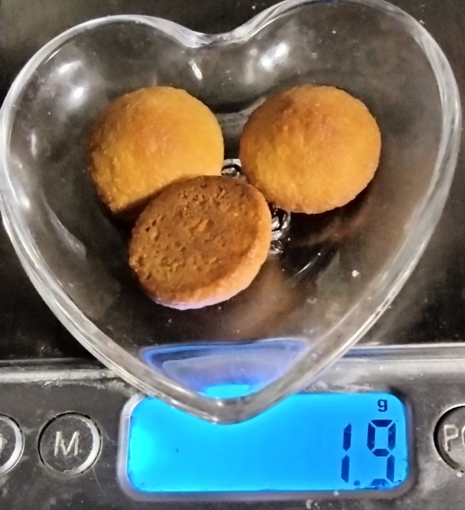 🐣ボーロより🤏だけ大きくて半円だからgは同じかしら一粒2.6kcal/0.6g4粒10kcal8粒なら🍬1個持ち時間は🍬の勝ちだけどカリ²噛むと食べた気になる場合もあるかな…