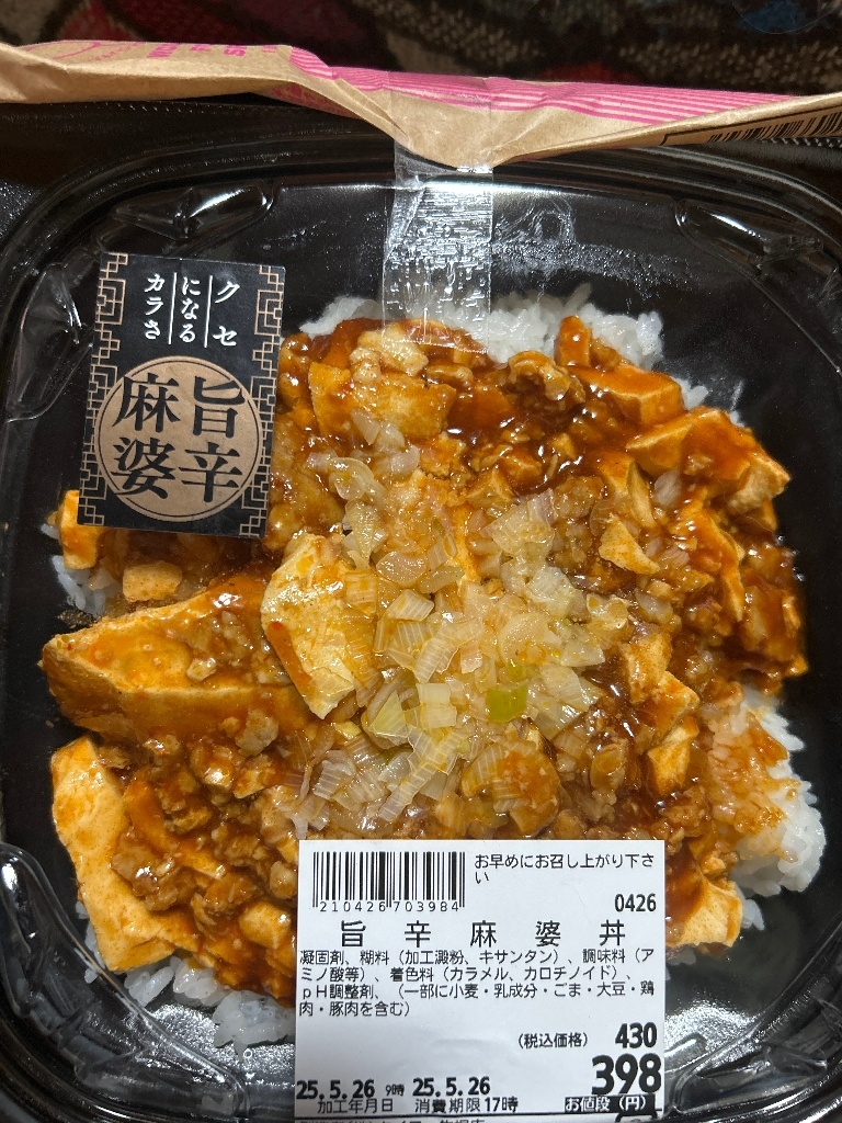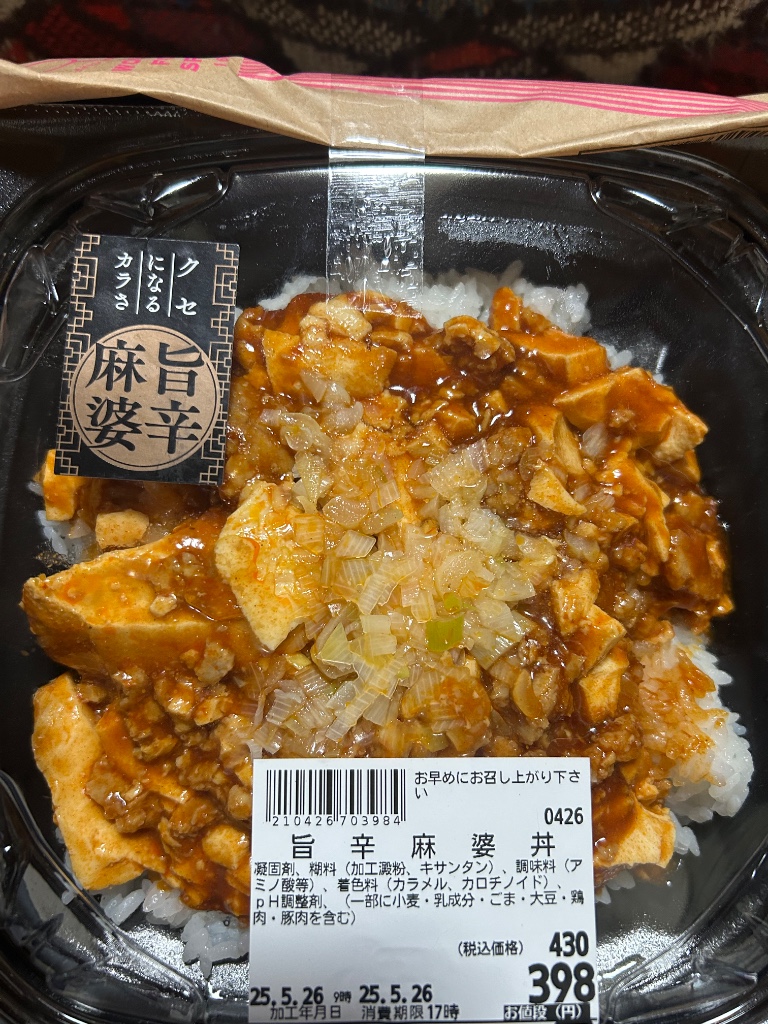 家族にお弁当を頼んだら買ってきてくれたもの 商品名 旨辛麻婆丼 麻婆豆腐が好きだから買ってきてくれたみたい ガッツリボリュームがあります タイヨーは、安くてボリュームがあるのでお弁当を買う時はタイヨーを利用しています 麻婆丼なので麻婆豆腐がのっています←そのまんま 豆腐の形はまばらで挽肉多め、ネギがいいアクセントとなっている ごはんも美味しい 旨辛ということで結構スパイスが効いている スパイシーです 辛いのでお茶など飲み物と一緒に。 辛いのが苦手な人に…続きを読む