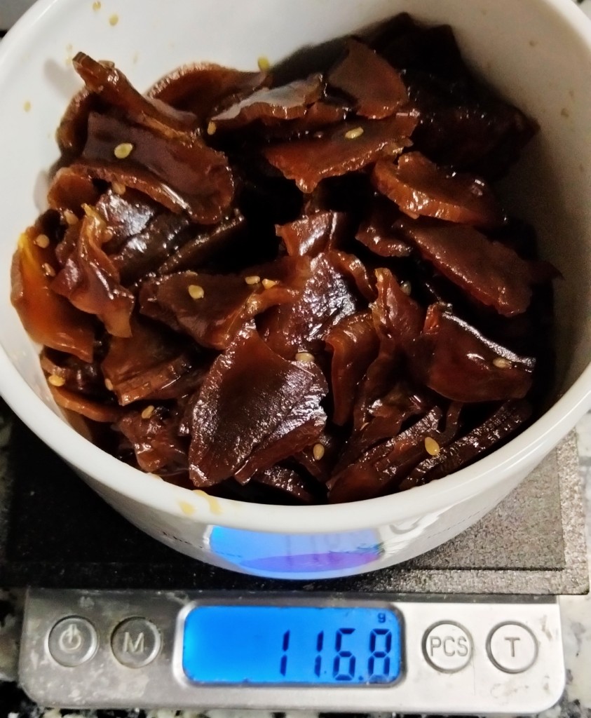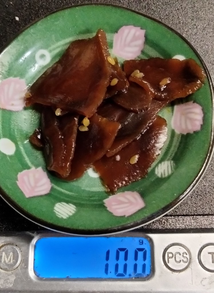 (刻み)だけど福神漬より大きめで桜漬け位よ真っ黒と言いたくなる真っ焦げ茶色漬け汁は21cc固形量90gあると嬉しい😍甘くて美味しい口コミありだから私にぴったりだと思ったけど甘さは甘ったるくなくてベタつかずさっぱりと福神漬の酸味を🤏抑えた感じ?食感は大根の漬け物で薄いにも拘らずハリハリ漬け程パリ²してなくて切り干し大根の煮物ほど柔らかくは無い…上手く言えないけど福神漬は七福神じゃないけど色々入って食感シャキッと感じるかも知れないけど大根だけなので食感は統一されてそう思うとツマラナさそうなのに止まらない…